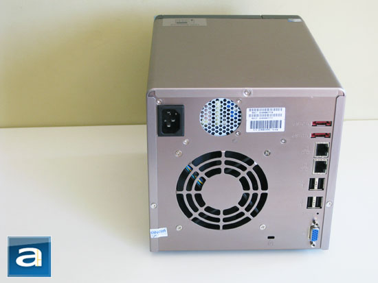 An 92mm single exhaust fan pulls heat out of your NAS server, with its exhaust vents cut into the steel panel. A small opening at the top provides ventilation for its internal power supply; there's a very small 20mm ball-bearing fan at the other side of the PSU. Its vertically oriented power input male connector is logically placed at the top left corner. Since the power supply unit automatically selects input voltage, there's no need for the old fashioned voltage selector switch stuff haha.
