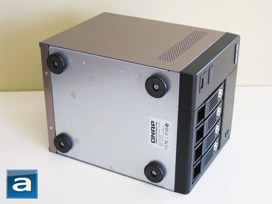 There's nothing particularly exciting at the bottom of the QNAP TS-439 Pro's chassis; what you'll see here are four large legs affixed on top of its steel frame panel. As always, they're installed to reduce vibration noise, increase grip, and prevent surface scratching. The left side of the network attached storage system features a neat array of small openings on its brushed aluminum shell. It is placed right next to where the motherboard is inside, to make sure hot air doesn't get congested inside.