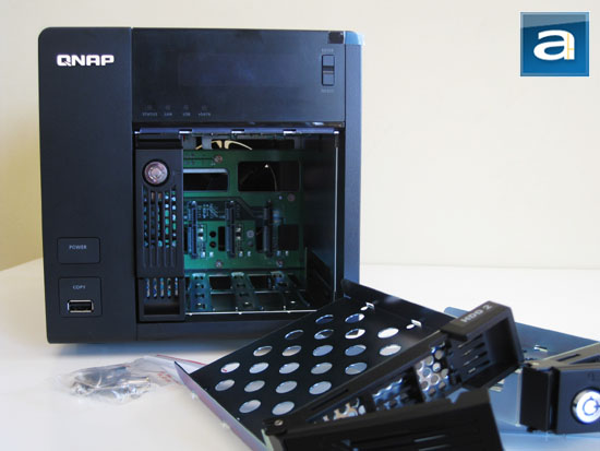 Since this is a SATA system, all hard drives are hot swappable. Removing the hard drive tray is very simple -- just release a lever at the bottom, and it's out. You can lock the levers with the included keys to discourage unintended disconnections. Each hard disk tray is labeled "Disk 1" to "Disk 4" consecutively, so you won't mix up which one is which when you have a bunch of them disconnected, as seen in the photo above. Each tray also features a maximum amount of ventilation openings for improved heat dissipation.