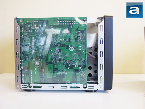 Removing its vertically mounted 3.5" SATA disk trays reveals the connector backpanel. The SATA backplane ports are powered by an external Marvell 88SX7042 controller, connected to the motherboard on the PCIe bus. Because of this, it should be noted that these drives are not boot configurable in the BIOS. If you plan to hack your system later on, you'll need an USB or eSATA drive. We'll go over the exciting details on Page 5.
