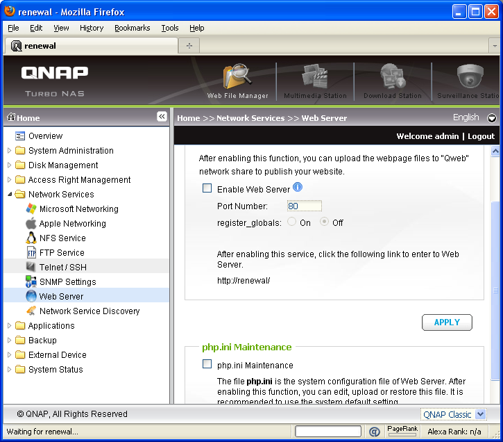 Following the designation of my file server names, the QNAP TS-439 Pro takes over as the main network attached storage system here at APH Networks. Therefore, it retains the name "Renewal"; used since 2007.