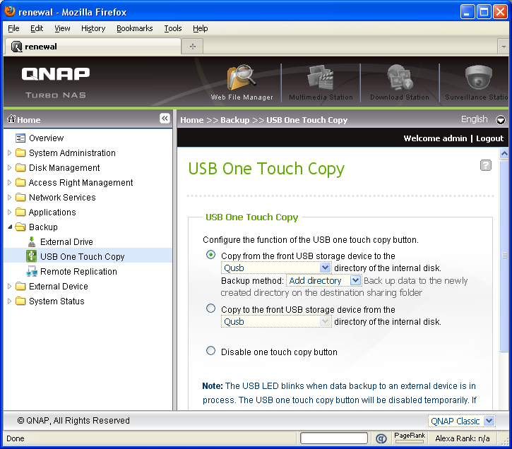 In the Backups heading are three sections. These include External Drive, USB One Touch Copy, and Remote Replication. In the External Drive screen, you can back up select data on your NAS to an external drive connected via USB or eSATA. (Now when you've thought your NAS is used for backups, you can even backup your NAS!) I have taken the screenshot for USB One Touch Copy, which as you can see configures the function of the front one touch copy button. You can use it to copy data from an external drive to a specific directory on the NAS, copy data from a specific directory on your NAS to the external drive, or disable it completely. Remote Replication lets you configure your QNAP TS-439 Pro to copy data to a remote server of the same NAS series, and backup from remote server to the local server as well. You can also set its port number, and allow/disallow remote Rsync server to back up data to the local system.