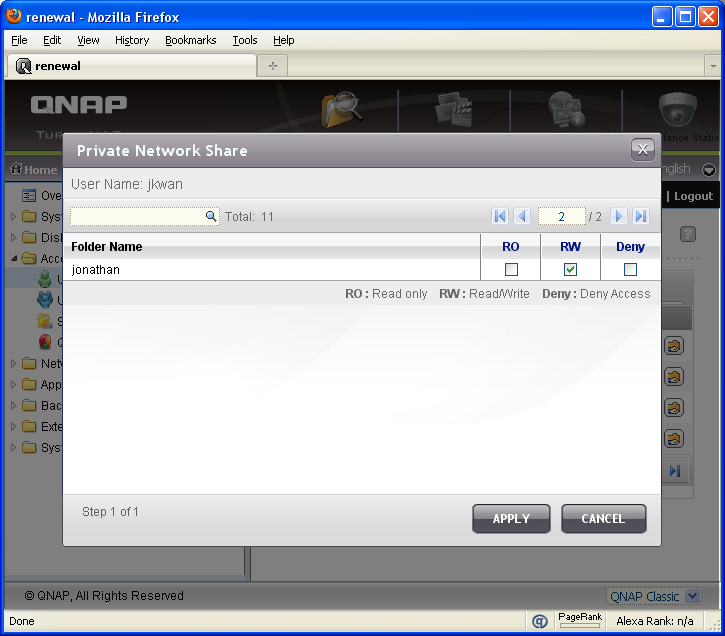 Under the Access Right Management folder tree are four options: Users, User Groups, Share Folders, and Quota. In the Users screen, a table lists all users in the system, as well as their respective independent disk quota and account options. Four icons represents four different account functions; of which they are Change Password, Edit Account, User Groups, and Private Network Share. The screen above is an AJAX popup displaying the Private Network Share option, which allows the administrator to set folder access permissions for each person. This can be seen in the screenshot above. In the Users main screen, you will also have the option to search, create, multiple create, and delete accounts.