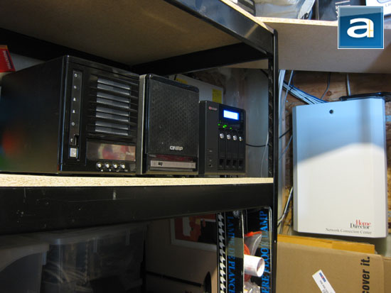 For our tests, the QNAP TS-439 Pro is placed in the networking room in our basement, where all the network outlets in the building leads to. Our QNAP TS-439 Pro is placed on the right of the Thecus N4100PRO and QNAP TS-409 in our storage room, respectively. Our test station is located two stories away from the NAS to simulate real world performance in a centralized networking environment. A NETGEAR GS-108 Gigabit switch handles the communication between the two.