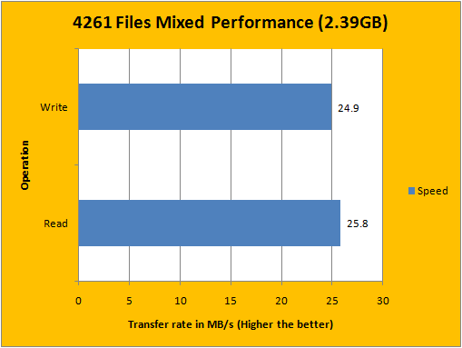 Our proprietary multifile read/write benchmark (Now redesigned to work more accurately with large storage systems) did in fact slow significantly when we tried to copy 4261 files totaling 2.39GB into the system. While this may be partially inhibited by drive speed on both ends, this usually tests CPU and memory of the target device as well -- it would be fairly disastrous if the NAS system was underpowered in both regards. The QNAP TS-439 Pro kept up pretty well, and resulted in approximately 25MB/s sustained performance for both read and write, as shown in the graph above.