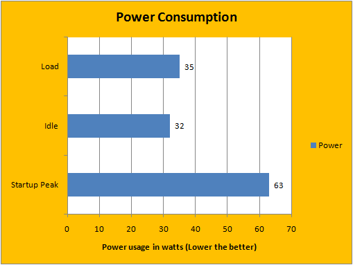 With two hard drives installed, our QNAP TS-439 Pro's power consumption is measured to be 7-9W more than the TS-409. It's not very significant; and that's to mention that the TS-439 Pro is significantly more powerful than its predecessor. I believe that the relatively insignificant increase in power consumption is well justified by all means. The peak power usage during initial startup was 63W; which drops to a sustained 34W when it's loading. Idle power usage with both drives running is 32W. When it's under full load with both drives (Three computers accessing both drives on the system at the same time), power usage rises to 35W. Power factor is generally excellent at 93% to 98% at 15% nominal load on the power supply.