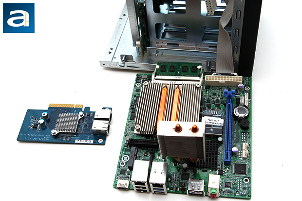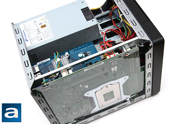 Unless you are someone determined to void your warranty and persistent enough to rip your new $1000+ file server apart, it is actually quite a challenge to dig into the further details on this product. I bet the guy who designed the chassis was probably thinking to himself, "No one is going to take this product apart, but if someone tries, I will make their life as hard as possible." Even the shell was quite a challenge to remove -- I had to take out my nylon pry bars I use for taking my car interior panels apart to get started. As we move into the product, QNAP has 'conveniently' made everything interlocking -- for example, the motherboard cannot be removed unless you release the SATA backplane, which cannot be taken out by itself, since one of the many screws are blocked off by the chassis frame. But if you are as inclined as I have, then a bit of persistence and a couple hours of time will prove to be quite rewarding. After disengaging the chassis back panel, remove all the screws you can on the SATA backplane. You will notice one screw cannot be touched unless you relocate an interfering metal frame piece. This can be done by taking out another two screws that locks that part in place on an adjacent piece. With the SATA backplane loosened, be careful not to break the big capacitor that prevents you from taking the whole thing out. However, the small bit of wiggle room will allow you to remove the motherboard without resorting to even more disassembly. With all the cables disconnected, we can finally really take a closer look at the hardware under the hood.