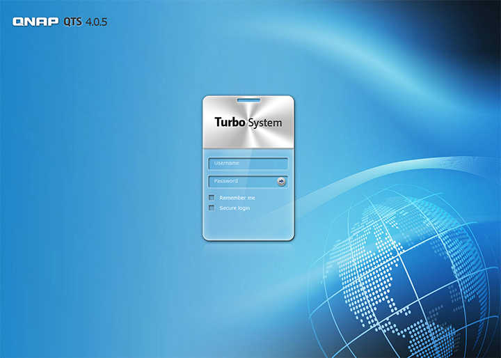 After your system has been initialized, fire up your web browser of choice, and type in your server's name, or your TS-470's LAN IP address once again. You will be immediately greeted by its main screen. The main screen has been cleaned up since V3; now you will only get a login dialog box. Everything else is placed on your desktop after logging in. Enter your username and password, and you will have two additional options: Remember Me and Secure Login.
