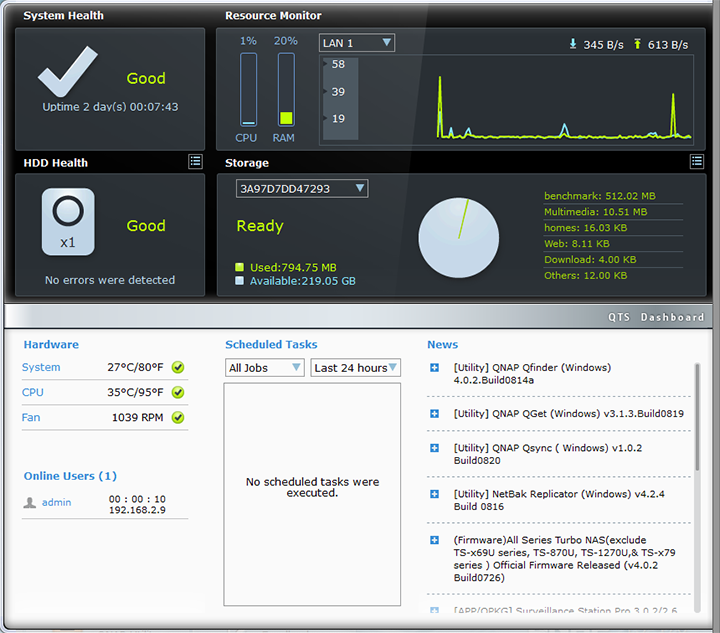 At the bottom half, the hardware system monitor provides information to the system temperature, CPU temperature, and fan speed. Online users are also displayed here. A list with filter shows all the scheduled tasks. Finally, a feed containing latest QNAP news can be seen at the bottom right corner. Overall, I found the dashboard to be extremely useful; it provides vital system statistics all in one easy to access screen.