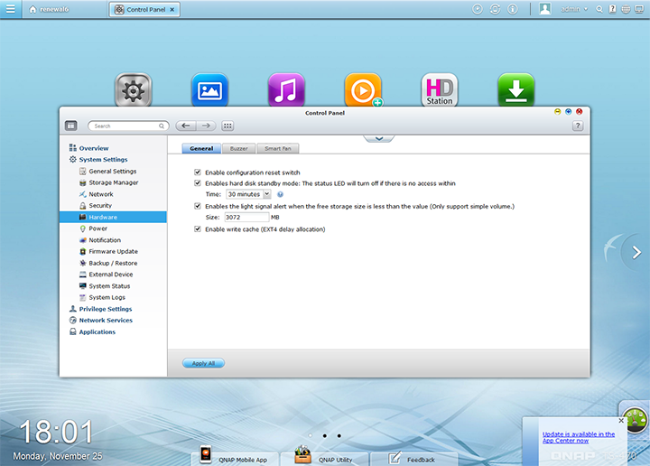 The main part of the desktop is a matrix of large icons, which reminds me of Apple's iOS. You can drag the icons around, remove shortcuts, and add your own items here, just like a real desktop. Like iOS, you can have three pages of desktop icons. At the bottom, there are three links to QNAP's website for the user's convenience. The Dashboard can be popped in from the right when clicked, and shows vital system information such as CPU load and HDD health, in which we will go over in just a moment. Meanwhile, a clock resides at the bottom left corner, as you can see in our screenshot above. QNAP's QTS 4.0 desktop concept is very user friendly an intuitive in my opinion. My only gripe is some items that appear to be mere tabs, such as Storage Manager under Control Panel, will open up an entire new window, rather than change the screen as the interface suggests. A little more consistency here will definitely be appreciated.