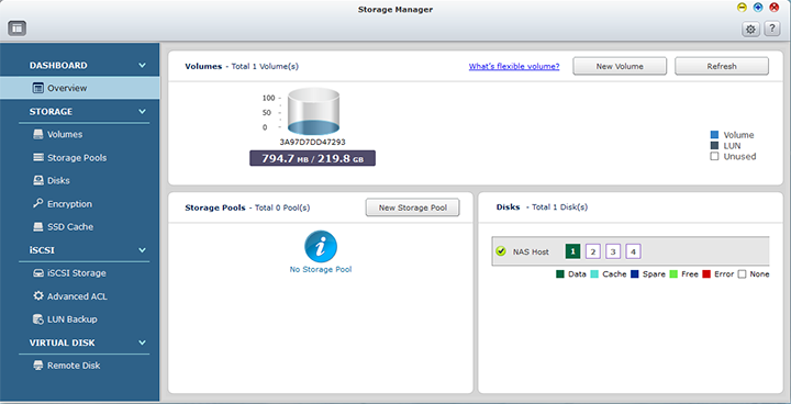 Hitting Storage Manager opens up an entirely new screen, as aforementioned. The screen shown above is the Overview screen. On the left, a menu allows you to switch between tabs to manage your hard drives, create storage pools, and manage RAID arrays. A Storage Pool is designed to amalgamate multiple hard drives into a large storage space, and provide enhanced RAID protection for the volume. Under the Disks tab displays the state of the drive (A big, green "Good" is all you need to see haha), along with information such as hard disk model, capacity, temperature, test time, and test result on the side. In the Disk Health submenu five tabs for the user to easily work with their HDD SMART diagnostic data. The Hard Disk Information tab displays more detailed data, such as your drive's serial number and firmware version. The SMART Information tab provides a summary table on diagnostic results. The Test tab gives the user an option to run a Complete or Rapid test immediately; while the final tab, Settings, can activate or deactivate a temperature alarm, as well as automatic scheduling automatic SMART tests.