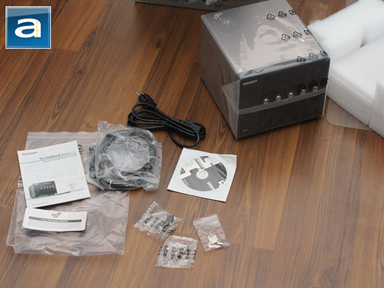 Opening the retail box reveals the QNAP TS-559 Pro II clipped between two large Styrofoam brackets, and wrapped in a large plastic bag to ensure there are no bumps and scratches occurring during transport. The accessories box seen in past models is now replaced by a large resealable plastic bag with everything other than the power cable inside. Overall, it is very well packaged in both a practical sense and aesthetically speaking manner.