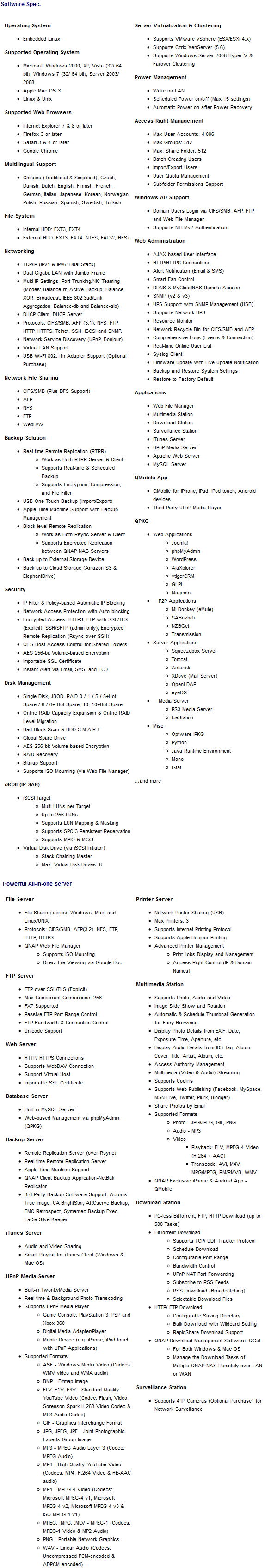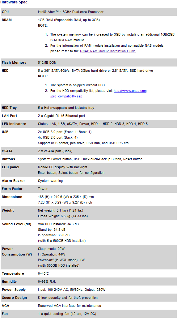 Before we move on, let's take a look at the features and specifications of the QNAP TS-559 Pro II, as obtained from the manufacturer's website: