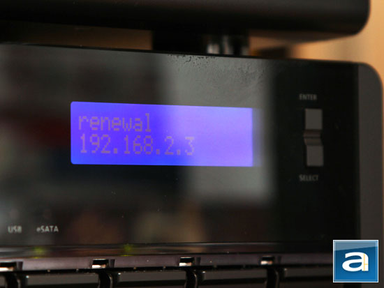 The LCD screen does a great job and showing system information and status; once it's on, it will show the server name and IP address, as shown above. A secondary screen displays the model number (TS-559 Pro II) and firmware version. Holding the "Enter" button for two seconds reveals a menu for various configuration and maintenance tasks, as well as displays some vital information such as system temperature. The screen will turn off automatically if it is not being used.