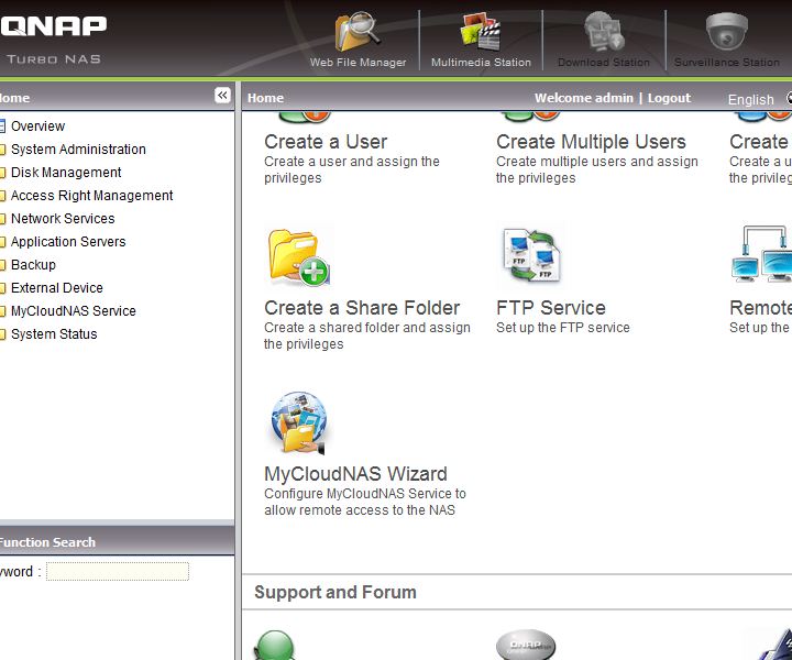 The main window is placed directly to the right of the interface's navigation bar. The home screen features seven quick shortcuts to its respective labeled function, again, as seen in the screenshot above. Right under it is a section that has three different icons that links directly to QNAP's support form, forum, and wiki, in that order. A news feed shows latest software updates and news applicable to QNAP devices.