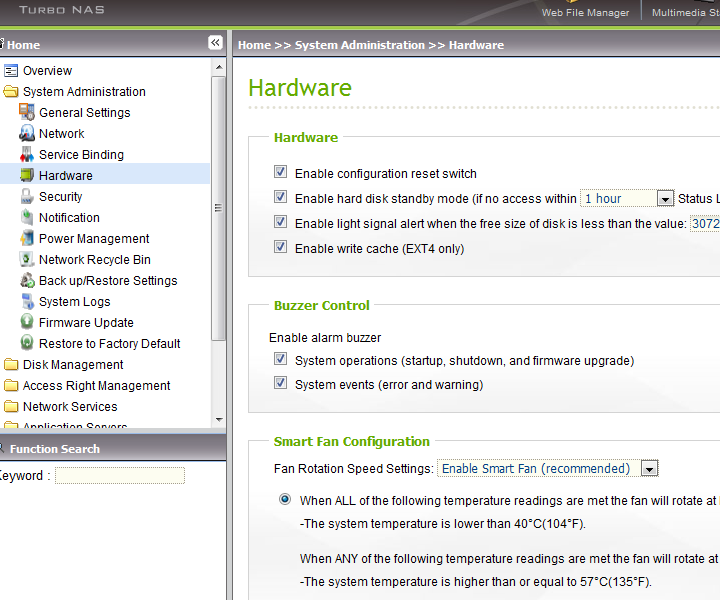 While I won't go over every menu, I'll briefly go over most of them -- since most of them are self explanatory anyway. Expanding the first menu item is System Administration. General Settings allows the user to adjust server name and port, date and time syncing options, as well as default language. The Network screen has TCP/IP and DDNS settings. Here you can enable Jumbo Frames and Network Port Trunking (Mine is set on Balance-rr mode with both Gigabit LAN adapters attached to my NETGEAR GS-108 switch). Service Binding is a new feature in QNAP V3.5. Basically, it allows the system administrator to selectively enable services based on the client connection interface. This is especially beneficial for security and network bandwidth optimization. The screenshot above has the Hardware screen shown; permitting the user to configure aspects like disk standby mode and fan speed settings.