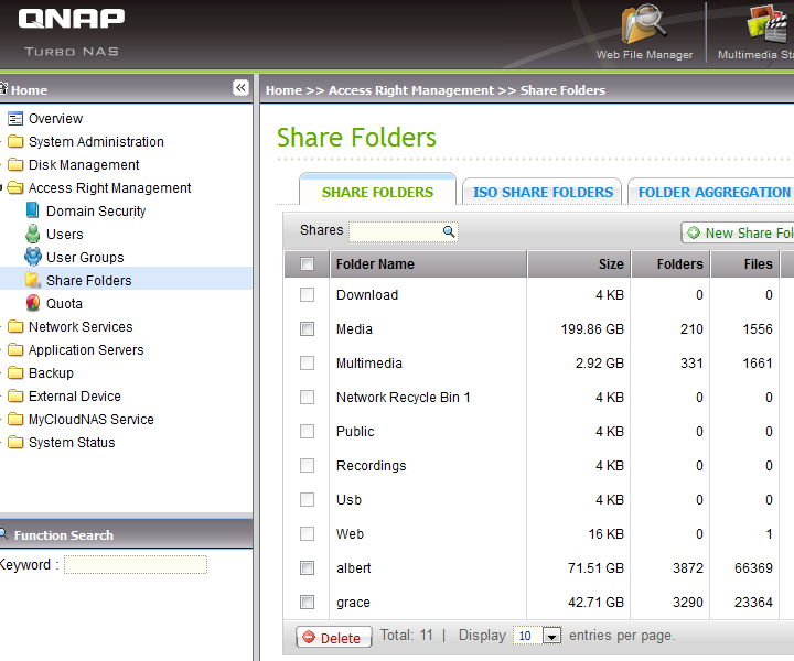 Under the Access Right Management folder tree are five options: Domain Security, Users, User Groups, Share Folders, and Quota. The Domain Security section provides different authentication options, including local user, active directory, and LDAP authentication. In the Users screen, a table lists all users in the system, as well as their respective independent disk quota and account options. You will also have the option to search, create, multiple create, and delete accounts here. Four icons represents four different account functions; of which they are Change Password, Edit Account, User Groups, and Private Network Share. The screen above is is the Share Folders screen, listing an array of folders on the system, similar to the table displayed for the Users screen. It also shows each folder's size, folders within, number of files, and if it is hidden in their respective column. Again, there are four management options for each folder: Properties, Access Control, NFS Access Control, WebDAV Access Control, Microsoft Networking Host Access Control, and Refresh. Pulling up the Properties menu gives you the option to set the folder's path (If you have multiple single disks installed, you can also set which drive it belongs to), hide or show the folder, as well as locking the file. You can also enable write-only accesses over FTP.