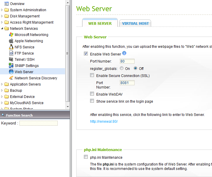 Shown in the screenshot above is the Web Server configuration screen. You can enable or disable its HTTP server, set its default public port, enable/disable WebDAV, and turn on php.ini maintenance. In the Network Service Discovery function, there are two tabs: Enable/disable UPnP discovery service, and broadcasting services through Bonjour. These services include Web Administration, SAMBA, AFP, SSH, FTP, HTTPS, UPnP, and QMobile.