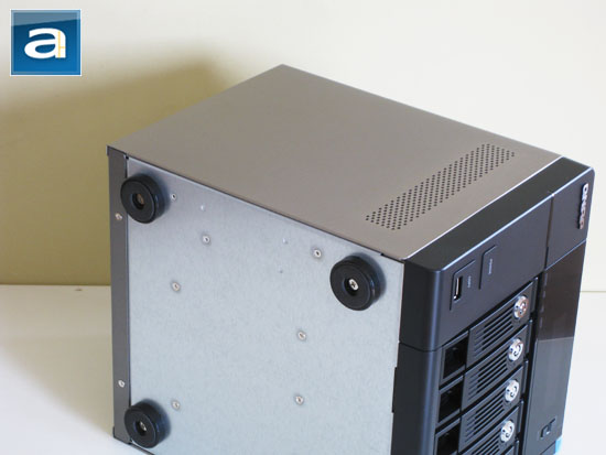 While the QNAP TS-559 Pro+ is constructed on a steel frame, its shell that covers three sides of the system is composed of brushed aluminum in gunmetal with a black overtone. This not only improves heat dissipation due to thermal properties of aluminum, but also makes it look incredibly attractive in my opinion!