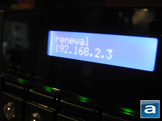 The LCD screen does a great job and showing system information and status; once it's on, it will show the server name and IP address, as shown above. A secondary screen displays the model number (TS-559 Pro+) and firmware version. Holding the "Enter" button for two seconds reveals a menu for various configuration and maintenance tasks, as well as displays some vital information such as system temperature. The screen will turn off automatically if it's not being used.