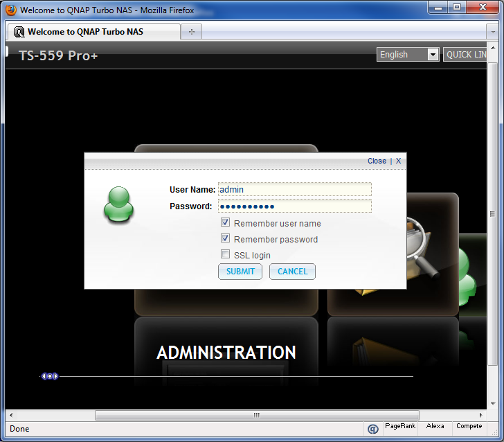 Fire up your web browser of choice, and type in your server's name, or your TS-559 Pro+'s LAN IP address. You will be immediately greeted by its main screen, which allows you to slide between its large dock style icons, and select the feature you want to run. For example, if you want to enter the administration panel, simply click "Administration". An AJAX popup will come up, as shown in the screenshot above. Enter your username and password, and you'll have three additional options: Remember user name, remember password, as well as SSL login.