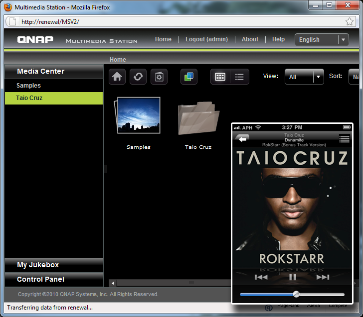 Last, but not least, I want to talk about QNAP's Multimedia Station. Basically, it is a Flash based web application that allows you to view and play media files located inside your TS-559 Pro+'s Multimedia folder. With Web Server and QMobile for iPhone/iPod touch enabled under the Bonjour tab in Network Service Discovery on your NAS, you can now stream media directly from your file server to your Apple iOS based device through QNAP's QMobile app (Available for free in the App Store). The app is snappy and easy to use from my iPhone. As far as the media interface is concerned, as shown in our screenshot above near the bottom right, basically looks like a lower quality knockoff of Apple's own iPod interface. My biggest problem is that it will stop playing once you leave this screen -- but the rest of the system is fairly unique. QMobile works over WiFi and 3G, so as long as your network attached storage is web accessible, you can access your music, photos, and videos from anywhere with internet access. Where data coverage may be unavailable, you can also cache up to 1000 songs on your Apple mobile device. With that sorted, as I would loosely quote Taio Cruz, you can now rock this club... and you can rock all night... just watch your bandwidth caps, haha. You can even upload images from your iPhone, iPod touch, or iPad directly to your TS-559 Pro+ too.