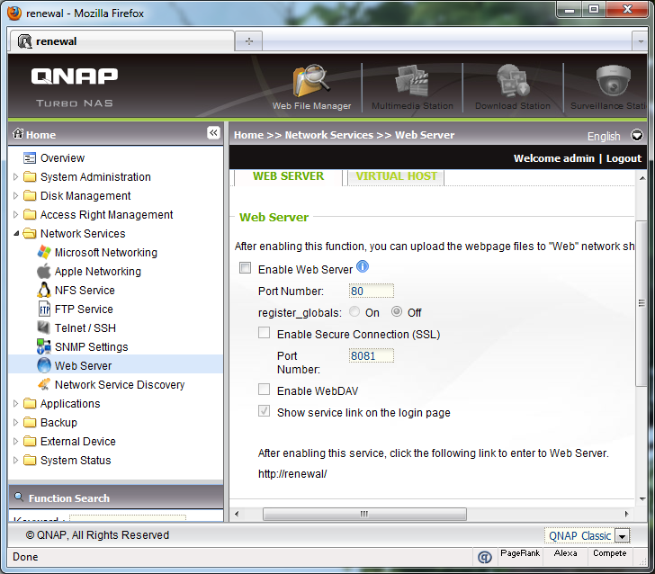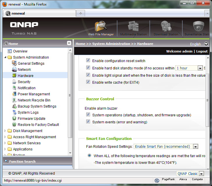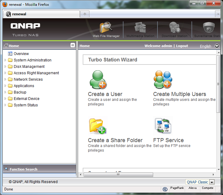 As aforementioned, the layout of its administration panel is absolutely brilliant. The sleek, clean interface is powered by mainly AJAX menus for snappy performance and convenience. At the left is a collapsible menu tree, while a static banner stretches across the top of your screen. The latest firmware adds on a search menu bar on the menu tree to allow the user to easily find the setting they want. Four icons are placed in the top right corner as shortcuts to Web File Manager, Multimedia Station, Download Station, and Surveillance Station, respectively. If the service it represents is disabled, it will be grayed out, as seen in our screenshot above. At the bottom is another static bar for QNAP's copyright line, and a drop down menu to select one of three available color schemes.