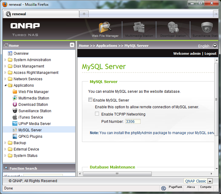Again, the Applications submenu is quite straightforward as well. Most of the listed sections, as you can see in our image above, are simply used to enable or disable their respective services. Features such as Download Station lets you torrent things through the QNAP TS-559 Pro+, and Surveillance Station works in conjunction with compatible camera models. One to note in particular is the MySQL server -- the QNAP TS-559 Pro+ has built in PHP and MySQL support, as well as an option to install phpMyAdmin. This is covered in its subsequent section -- QPKG Plugins -- which lets you install packages premodified for you by QNAP to install on your NAS. This includes a few worthwhile mentions such as phpMyAdmin as aforementioned, as well as WordPress and Joomla. You can even get stuff like PS3 Media Serve and Twonkymedia 4 to handle all your media streaming needs.