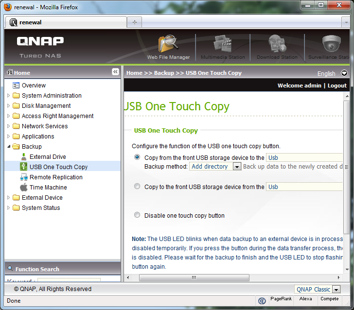 Under the Backups heading are four sections. These include External Drive, USB One Touch Copy, Remote Replication, and Time Machine. In the External Drive screen, you can back up select data on your NAS to an external drive connected via USB or eSATA. (Now when you've thought your NAS is used for backups, you can even backup your NAS!) I have taken the screenshot for USB One Touch Copy, which as you can see configures the function of the front one touch copy button. You can use it to copy data from an external drive to a specific directory on the NAS, copy data from a specific directory on your NAS to the external drive, or disable it completely. Remote Replication lets you configure your QNAP TS-559 Pro+ to copy data to a remote server of the same NAS series, and backup from remote server to the local server as well. You can also set its port number, and allow/disallow remote Rsync server to back up data to the local system. QNAP V3.3 adds Apple Time Machine support. Once enabled, you can use the NAS as one of the Mac OS X Time Machine backup destinations.