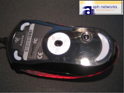 The bottom of the mouse. The middle is the heart of this product, the Razer Precision laser engine and sensor. It says 320nm Precision on the left side of the circle around the lens and CL1 Eyesafe on the right. I guess some laser mouse owners are afraid to look into the sensors because it's labelled as laser. (Don't worry, its perfectly safe to look into it).