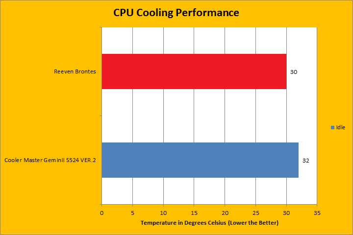 While the computer was idle, the Reeven Brontes did admirably, especially considering it is smaller than the Cooler Master GeminII S524 Ver.2, yet it performed better. The Reeven Brontes reached a stable temperature at 30 degrees Celsius, which is average considering its size and the processor underneath. However, the fan had to work quite a bit to keep the temperature at this point, and so was not as quiet as some of the other coolers during idle. Idle temperatures only give a small indication of the possible performance of a cooler, so let us have a look at its performance under load for some real comparisons.