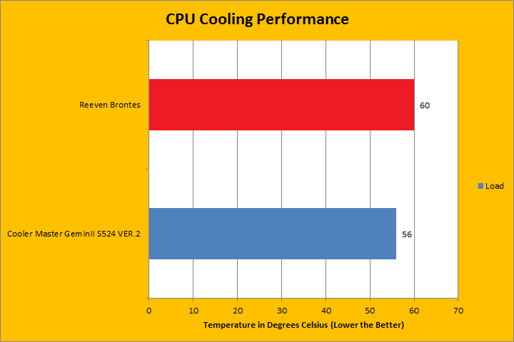 After using Prime95 to put the computer under load for the required time, we saw the actual maximum performance of the Reeven Brontes, of which I was happy. For such a small air cooler, it did well; stabilizing at a respectable 60 degrees Celsius, which was only four degrees higher than its closest counterpart, the Cooler Master GeminII S524 Ver.2. Even though the Reeven Brontes produced the higher temperature on this list, consideration for its size and design purpose needed to be taken. With such a small sized cooler only being four degrees hotter than another one, albeit much larger, was an impressive feat. One point to note is the Reeven Brontes is designed for much smaller chassis environments, instead of the big and great airflow the SilverStone Primera PM01 offers. In smaller builds temperatures will most likely be higher, due to more constricted airflow in tighter environments.