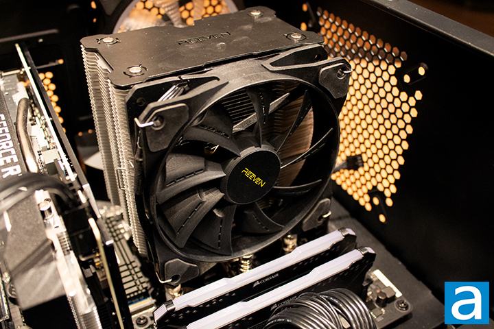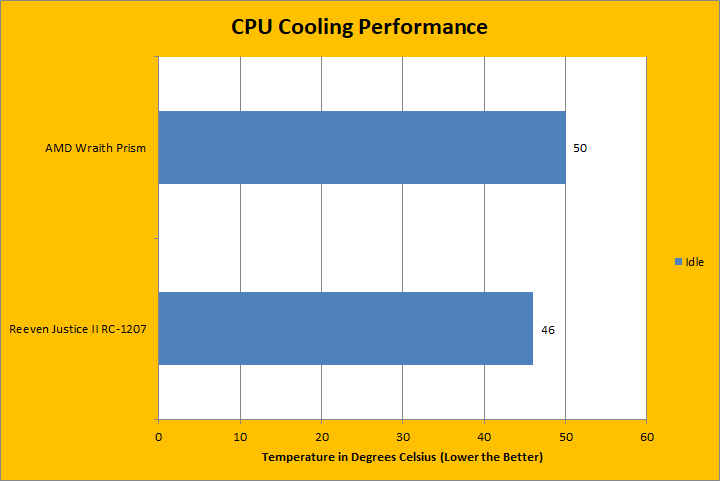 All tests were run in our custom-built computer to best reflect real life performance. The computer remained in the same place and room for all tests. The ambient temperature of the room was roughly 18 degrees Celsius. The thermal paste applied to each cooler was stock respective to their manufacturers to rate its performance. Sufficient time between testing was applied for the paste to settle. The fans on all heatsinks were connected to the same motherboard's 4-pin connector. The test computer was turned on and idling for at least one hour for the idling tests. High CPU load results were obtained using the Prime95 in place large FFTs test with sixteen worker threads for a minimum of fifteen minutes and recorded when the temperature was deemed stable. The Reeven Justice was tested using the stock Zephyros II fan sent from the factory. The performance was compared with the AMD Wraith Prism that comes with the Ryzen 7 3700X. The purpose of this comparison is to find the relative performance between products. The temperature results for each cooler was measured with CoreTemp, which records the CPU’s integrated thermal sensor for maximum accuracy. Each temperature result was calculated by taking the maximum value of the cores inside of the CPU.