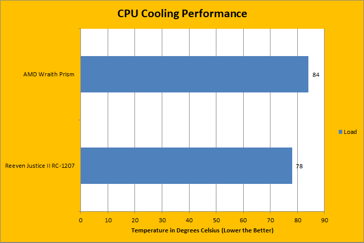 After enough time of stressing the CPU, I was able to push these two coolers to see what they could do. After about 25 minutes, the Reeven Justice II RC-1207 was able to maintain a constant temperature of 78 degrees Celsius. The Justice II RC-1207 came in 6 degrees lower than the stock AMD Wraith Prism. Note the sizes between these two coolers are quite noticeable as the Justice II RC-1207 has a larger heatsink and fan. Additionally, the design of the Justice II RC-1207 is a lot better in terms of the direction of air flow. Given these factors, it is obvious that the Justice II RC-1207 would come out on top. The temperature difference was pretty noticeable in this case. Having a better design will always produce better performance. The Reeven Justice II RC-1207 is capable of keeping the CPU reasonably cool in heavy workloads.
