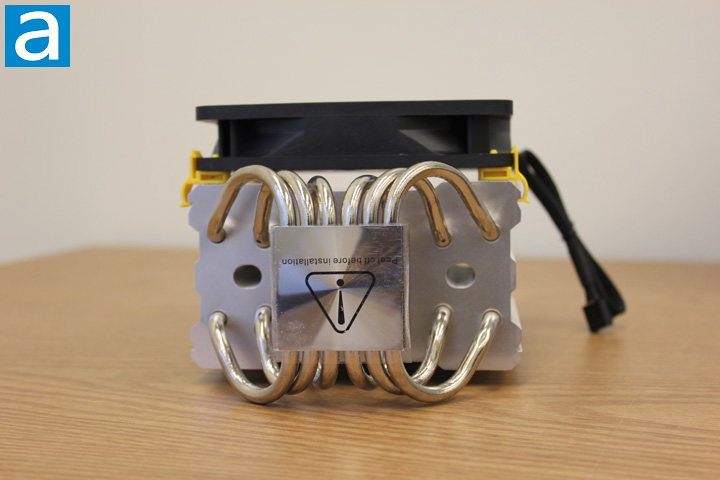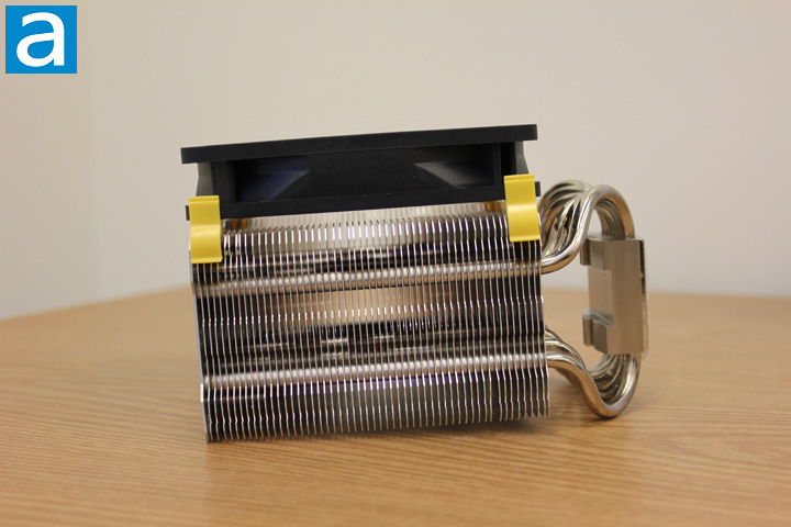 For the Justice RC-1204, the orientation of the heatpipes are perpendicular with the fan mounting surface of the heatsink. This feature makes the alignment of heatpipes different from that of other CPU coolers such as its brother the Reeven Ouranos RC-1401. In this case, the heatpipes are aligned in two rows into the radiator fins, while for the Reeven Ouranos RC-1401, there are six rows. The layout of the heatpipes of the Justice RC-1204 allows the heat to be evenly distributed to the fins. From the above picture, you can see the fan is attached to the heatsink's fins by using yellow plastic clips. The plastic clips look sturdy, however, if I could choose, I would prefer the wire clips, since I believe the wire clips are easy to use and pretty solid. Anyway, as long as it does not take screws to attach the fan, I have no complaints.