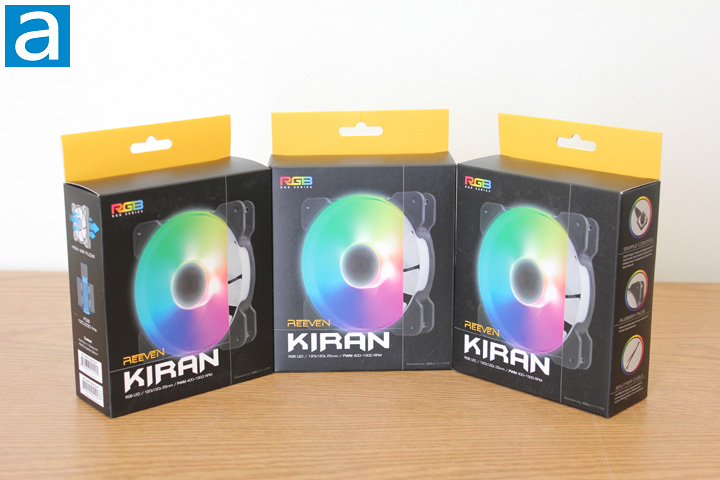Taking all three fans out of the shipping parcel and putting them on the table is quite an enjoyable sight. The background color of the retail package is black, and it provides a good contrast to the fan's photo. Just by glancing at the packages, the first thing that catches my eye are the fan's RGB effect. There is also a RGB label printed on the top-left corner of the retail package. It is not hard for a customer to notice this is a RGB cooling fan. On the bottom of the package front cover is the Reeven company logo. The product model name Kiran is printed below the company logo. Flipping the retail box over, there are several RGB effect examples of the product. Overall speaking, the package design is pretty good in my opinion, since you can spot all the useful information like the RGB features, size, and looks of the fan fairly easily.