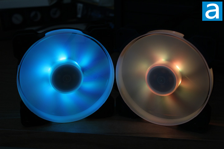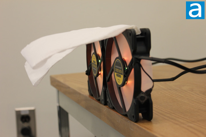 In the first photo, you can see the results of our test. As shown, the fan provided enough static pressure to keep the tissue paper almost parallel to the ground, and the amount of airflow in both cases was high enough to keep the rear end of the tissue paper floating. Small vibrations were noticed at the very end of the tissue paper due to the turbulence on the paper edge. Note, the turbulence was the result of using tissue paper; it has little to do with the airflow and air pressure performance of the fans. The following photo demonstrates the RGB lighting performance of the Reeven Kiran. As you can see from the photo, the light was diffused pretty well throughout the impeller area, thanks to the six LEDs behind the motor housing. I also noticed the colors were well tuned and they were true to the specifications.