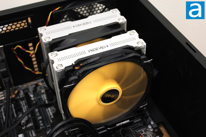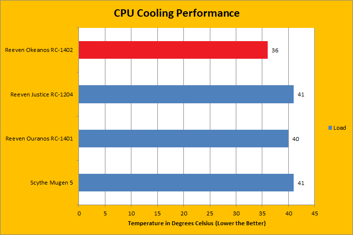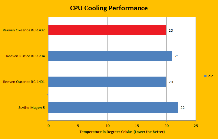 All tests were run in our custom-built computer to best reflect real life performance. The computer remained in the same place and room for all tests. The ambient temperature of the room was roughly 22 degrees Celsius. The thermal paste applied to each cooler was stock respective to their manufacturers to rate its performance. Sufficient time between testing was applied for the paste to settle. The fans on all heatsinks were connected to the same motherboard 4-pin connector. The test computer was turned on and idling for at least one hour for the idling tests. High CPU load results were obtained using the Prime95 in place large FFTs test with four worker threads for a minimum of fifteen minutes and recorded when the temperature was deemed stable. The Okeanos RC-1402 was tested using the stock fans from the factory. The performance was compared with three other air-cooled CPU coolers that feature single fan design, namely the Reeven Justice RC-1204, the Reeven Ouranos RC-1401, and Scythe Mugen 5. The purpose of doing such tests was not for a performance competition, since they were quite different in terms of fan size; it is only for relative performance comparison. The temperature results for each cooler was measured with CoreTemp, which reports the CPU's integrated digital thermal sensor for maximum accuracy. Each temperature result was calculated by taking the maximum value of the cores inside the CPU.