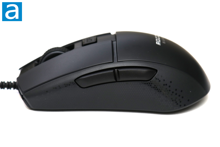 From the left perspective of the ROCCAT Burst Pro, you can see all of the buttons you have access to when holding the mouse. The primary buttons on the top are separate from the rest of the shell to reduce the resistance you might feel if the buttons were part of the rest of the body. Underneath, we have ROCCAT Titan Optical switches with an endurance rating of one hundred million actuations. Compared to the typical Omron switches we usually see, I found the ROCCAT Burst Pro primary buttons to feel lighter and sound quieter. This is not something that is bad, but rather something to get used to. I will say the primary buttons still do feel satisfying to click.