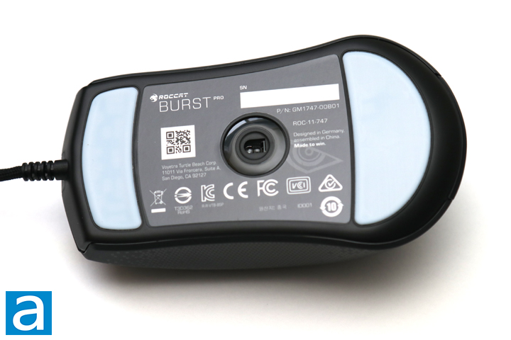 Flipping the ROCCAT Burst Pro to the undercarriage, you will see the large mouse feet and the sensor in between. The feet are made up of PTFE, which is commonly known as Teflon. These provide a smooth glide and travel. Just to note, the mice come with blue protective plastic on the bottom to protect this surface during transport. You should remove this protective layer when you start using the mouse. In the middle of the base is the ROCCAT Owl-Eye optical sensor, which is based on the PixArt PMW3389. This is probably similar to the sensor found in the Kain 120 AIMO, as both offer up to 16000 DPI sensitivity. Otherwise, the PMW3389 is one of the top-of-the-line PixArt sensors out there and can be found on many gaming-focused mice. The base PMW3389 tracks at high speeds of 400 IPS with acceleration up to 50g, although it is not enabled by default. Polling rate is set to a minimum 1ms, or a maximum frequency of 1000Hz, and a maximum resolution of the aforementioned 16000 DPI. The sensor is firmly attached to the mouse, so there is no sensor rattle found here.