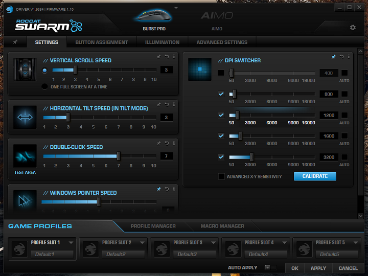 After selecting the ROCCAT peripheral for configuration at the top, there are four tabs for changing options on the Burst Pro. This includes Settings, Button Assignment, Illumination, and Advanced Settings. Under Settings, you can adjust specific things like various movement, scrolling, and clicking speeds. You can also adjust the sensitivity of the mouse. As I have mentioned previously, the Burst Pro supports up from 50 to 16000 DPI in increments of 50 dots per inch. Button Assignment is where you can set the functions to the different buttons, including changing even the primary buttons, though ROCCAT does make sure you at least have something assigned to the primary functions before you can reassign the main two buttons. These include macros, standard functions, media controls, and ROCCAT functions like Easy-Shift[+], which lets you add more functions via combining key presses.
