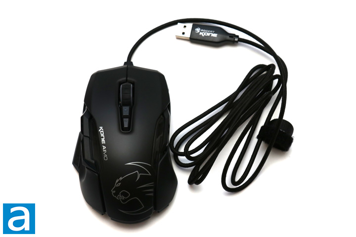 Taking out our measuring tape, the ROCCAT Kone AIMO measures in at 127mm in length, 83mm in width, and 43mm in height at maximum measurements. The maximum height occurs in the middle, though the curve drops off more quickly at the back of the Kone AIMO, while the front has a more gradual curve. When it comes to the scales, the ROCCAT Kone AIMO is a hefty 130g. Considering this mouse is targeted at medium to larger hands, all of the aforementioned dimensions make sense. The weight is slightly leaning more towards the front of the mouse, which is not aligned with the placement of the sensor. This could adversely affect performance when lifting up and placing down the mouse, but we will see later on in our performance tests. At the center of the top of the mouse, we have a black braided cable that leads out, measuring 180cm in length. I found the braided cable to be quite stiff and inflexible, which is disappointing. This can cause the mouse to catch on the edge of your table, so be sure to allow for some extra slack when using the Kone AIMO. At the end of the cable is a non-plated USB connector to connect the mouse and the computer.