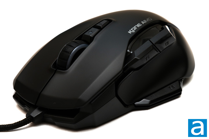 From this angle, you can see the deep left groove to place your thumb. In addition, you can see all of the buttons on the ROCCAT Kone AIMO at this side. As this is a right-handed mouse, all of the buttons are closer to the left side. At the front, we have our standard left and right buttons surrounding a scroll wheel. The buttons are slightly concave to make resting your fingers here feel natural. Underneath these main switches, we have what ROCCAT calls their "exclusive" switches. These are Omron switches rated at 50 million clicks. They offer a good tactile response and weight in each press. The scroll wheel is a notched wheel that allows for both horizontal and vertical scrolling. I know some people do not care much for horizontal scrolling, but I certainly like it. The wheel is stable and does not rattle about. Underneath the scroll wheel, we have two buttons marked '+' and '-'. By default, these increase and decrease between five DPI values. However, these values can be altered in the software. Finally, on the left side of the mouse we have three buttons near the thumb rest area. They all offer a decent amount of travel, though I did find the button actuation to be a bit mushy. Even so, I like the placement of the buttons, as they are out of the way of accidental presses, but within reach for intentional ones.