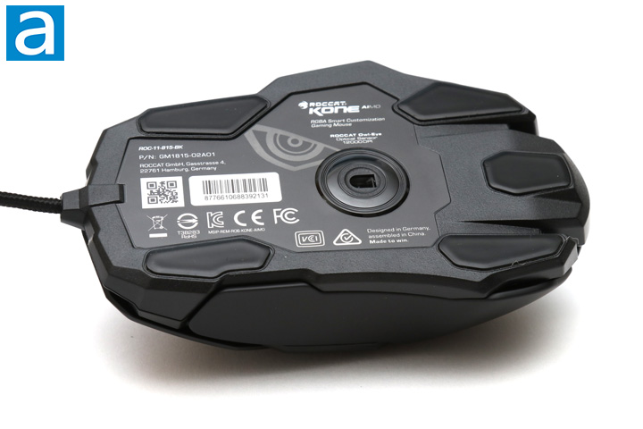Flipping the ROCCAT Kone AIMO over, we have whole array of polytetrafluoroethylene, commonly known as Teflon, feet to help with keeping a smooth glide. In the middle of the mouse is the opening for the sensor. The sensor in question is the ROCCAT Owl-Eye optical sensor. We have seen this in other ROCCAT mice, including the aforementioned Kone EMP, the Leadr, and Kone Pure Owl Eye. In PixArt terms, this sensor is a variant of the PMW3361. This sensor is specified to offer from 50 to 12000 DPI in sensitivity. While we do not have any datasheets particularly for this variant, the PMW3360 is said to track at high speeds of 250 IPS with acceleration up to 50g, though it is not enabled by default. Polling rate is set to a minimum 1ms, or as a maximum frequency of 1000Hz. The sensor is firmly attached to the body of the mouse and exhibits zero sensor rattle.