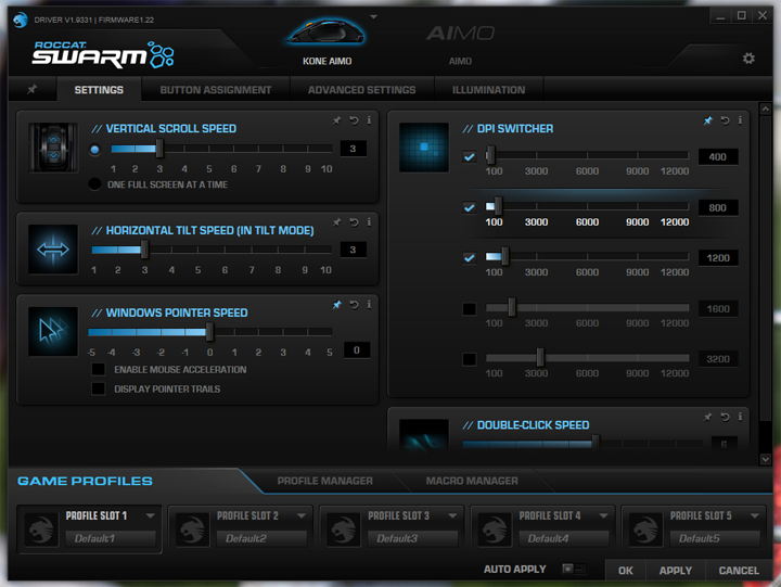 In terms of navigation, ROCCAT has five pages dedicated to the Kone AIMO. The first is a thumbtack, where you can pin your most used settings to the front tab. Next is Settings, where many sliders can be found to adjust scrolling, tilt, double-click, and pointer speed. You can also change the DPI levels, and a maximum of five settings can be saved to the mouse at any time. Under Button Management you can change the functionalities of all of the buttons. You can also enable Easy-Shift, which acts as a second set of mouse functions. This means you will have to set one of your standard buttons to be the Easy-Shift activator though. Under Advanced Settings, you can change the polling rate, calibrate lift off distance, enable angle snapping, and add sound feedback. Finally, the Illumination tab is where you can change the lighting and effects. As you may have already guessed, the two strips down the side of the mouse and the scroll wheel lights up in 16.7M available colors. You can pick from several different effects and even customize each of the LEDs found under the strips. Finally, there is the AIMO mode that reacts to different actions like mouse movements and clicks. You can also synchronize this with other AIMO products to get effects for keyboard events too. I honestly think the lighting on the Kone AIMO looks nice, but there are not as many effects as I would have liked compared to competitors like SteelSeries.