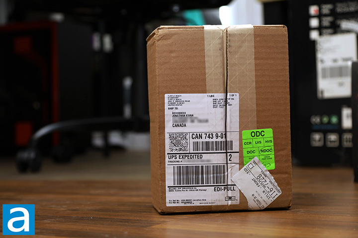 Our review unit of the ROCCAT Kone Pro Air arrived to us here in Calgary, Alberta, Canada from a shipping fulfillment center in Elwood, Illinois, USA. Using UPS Saver, the small brown corrugated cardboard box arrived in excellent condition to us here in Calgary, Alberta, Canada. I accidentally cut the box open before I took the photo, so hence the package was partially opened in my photo above.