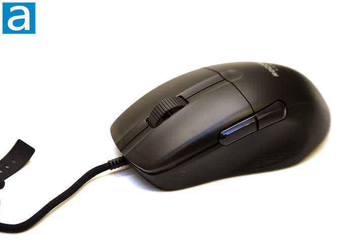 The ROCCAT Kone Pro does not come with a whole lot of buttons, but it does come with more than what most people will use every day. Combined with the previous image, you can see besides the standard left click, right click, and clickable scroll wheel, there is a forward and back button on the left, which is arguably standard nowadays. All of them are well-placed, so they are within easy reach, but are unlikely to be accidentally pressed. The ROCCAT Kone Pro's scroll wheel has a special name to it. It is called the Titan Wheel Pro, which is a thin three-spoke wheel milled from a solid piece of aluminum for minimal weight. The wheel is cool to touch at first, but the temperature changes quickly to match your fingers thanks to the material properties of aluminum. The Titan Wheel Pro feels great to use with low unsprung weight, smooth scrolling, and distinct notches.