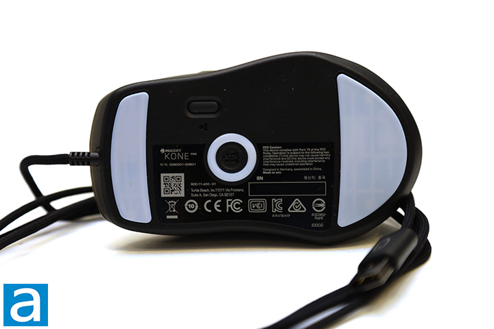The 66g weight of ROCCAT's pointing device is not adjustable, so you will need to deal with whatever the company think is the best for you if this ends up on your desk. 66g is really light, which makes a lot of sense for what this mouse is designed for -- first person shooter and multiplayer online battle arena games -- especially if you want something for quick, swift movements. It is heavier than the <60g Cooler Master MM711, but 9g lighter than its wireless counterpart, the ROCCAT Kone Pro Air. It is also 2g lighter than the Burst Pro. The Kone Pro's center of gravity is near the middle, which almost lines up with the sensor at the bottom.