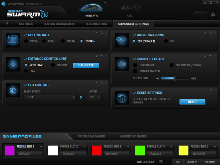 The Kone Pro works along with the latest version of ROCCAT Swarm, which is a 160MB download from ROCCAT's website at press time. This program unifies all your ROCCAT peripherals into one application. After installing the corresponding hardware module, you will be prompted to update the mouse firmware. Updating the firmware was a quick and painless process.