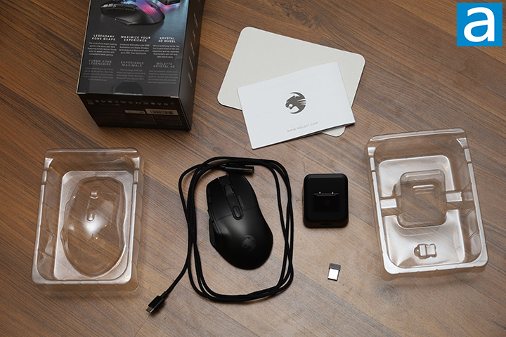 Out of the box, you will receive the ROCCAT Kone XP Air mouse placed in a clear plastic shell, rapid charge dock in a second clear plastic shell, PhantomFlex USB Type-C to USB Type-A cable, USB wireless adapter, and a quick start guide. The software can be downloaded from ROCCAT's website. The file size of ROCCAT Swarm is 131MB at press time. It should not take more than a minute to download given it is 2022 after all, and if you already have other peripherals from the company, you will not need to install a separate software suite.